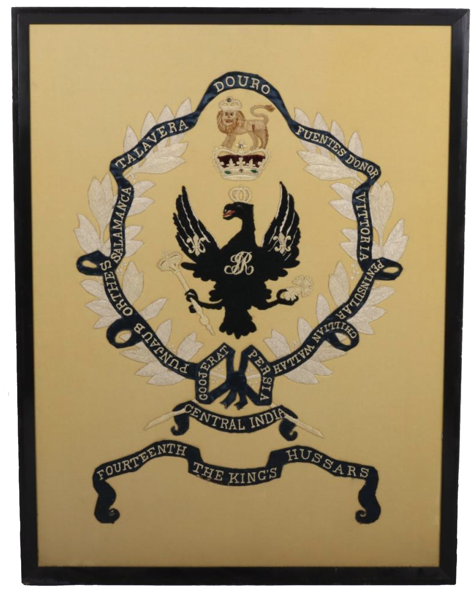 It is a Large Framed Early Regimental Embroidery of the 14th Kings Own Hussars, fine large embroidered regimental insignia with battle honours up to the Indian Mutiny (Central India). Crowned black Prussian style eagle below a lion and crown, encased within a laurel wreath with ribbon having battle honours. Lower ribbon with regimental details. All on a yellow felt backing and housed in a wooden frame.