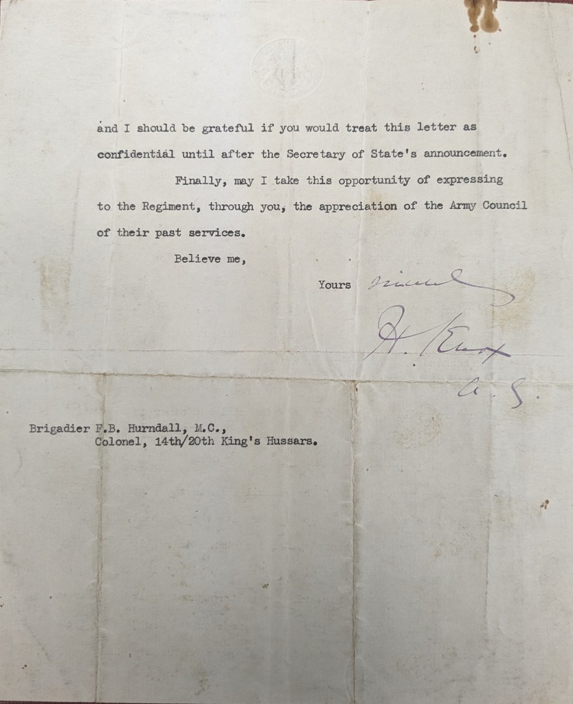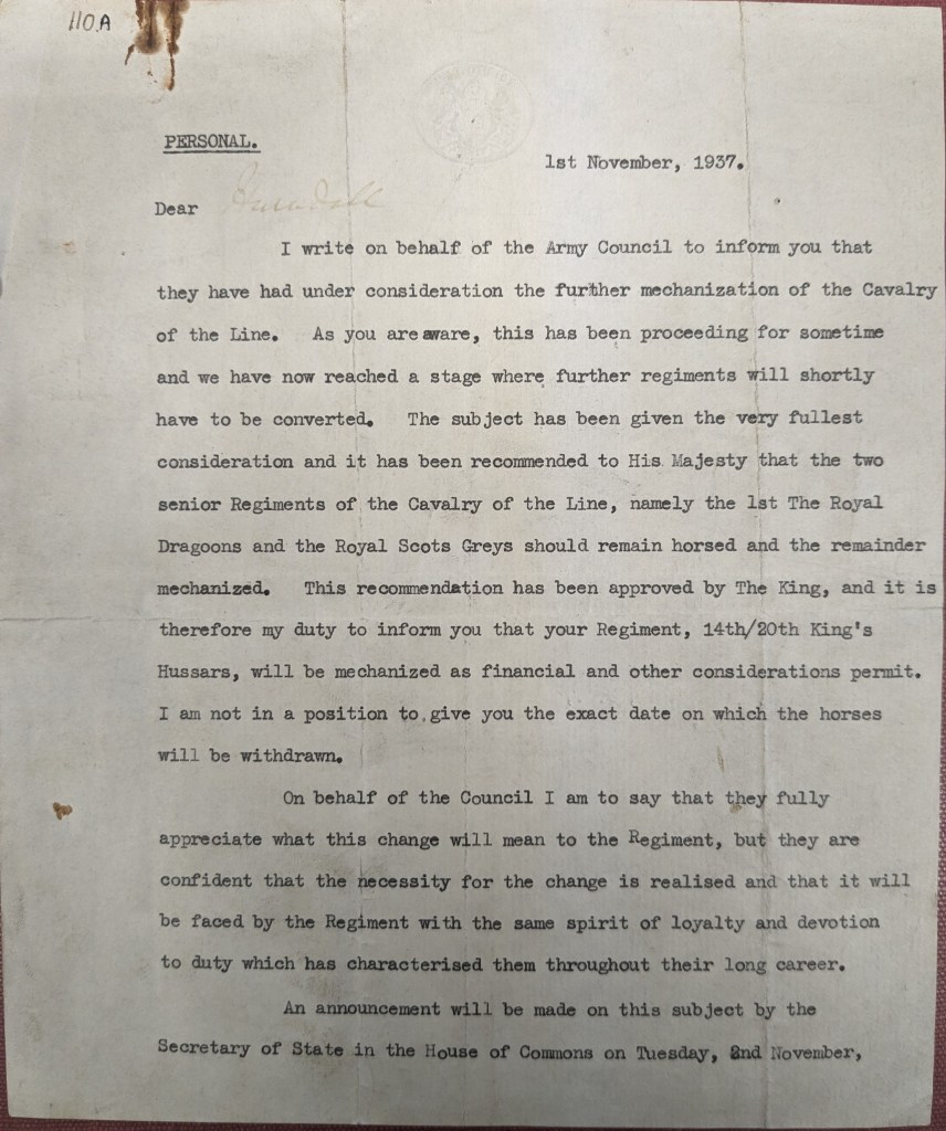 On the 1 November 1937 the Adjutant-General Sir Harry Knox writes to Brigadier F. B. Hurndall, Colonel of the Regiment, informing him that the final decision has been made to mechanise the 14th/20th King’s Hussars.