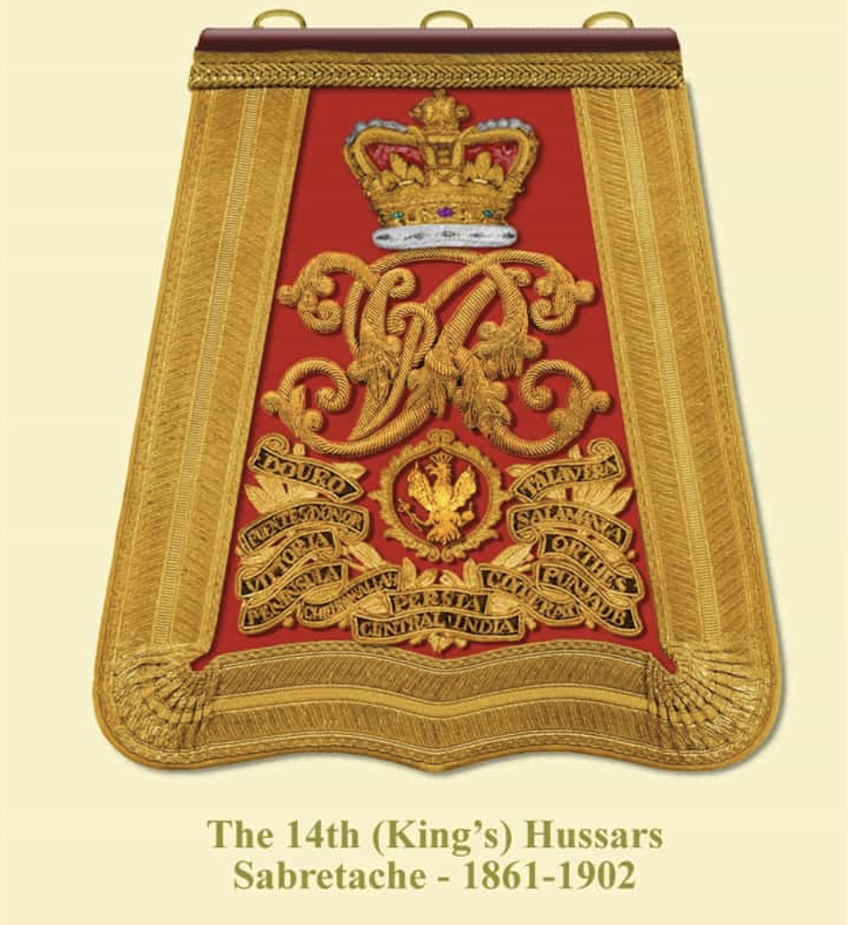 The scarlet faced sabretache was edged with gold herringbone lace with gold central stripe and piping. Beneath the VR cypher was a gold Prussian Eagle badge within a gold laurel wreath.