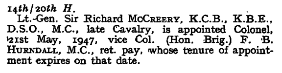 He succeeded Brigadier F. B. Hurndall M.C. in the appointment of Colonel of the Regiment on 21st May 1947.