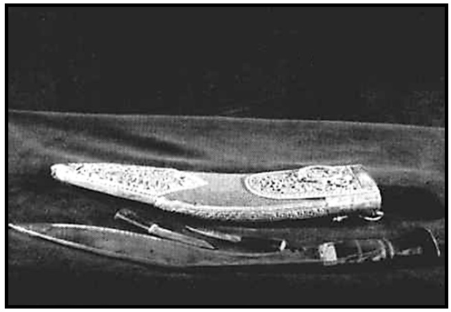 A contemporary Kukri presented to the Officers by the Officers of the 2nd Battalion 6th Gurkha Rifles in Italy in 1945 , as a remembrance of the close association between the regiments while serving in Italy together. A plain steel blade, encased in a sheath of superb oriental silver work, it is a wonderful reminder of the courage, fighting skill and colourfulness of the Gurkhas. (Click to enlarge)
