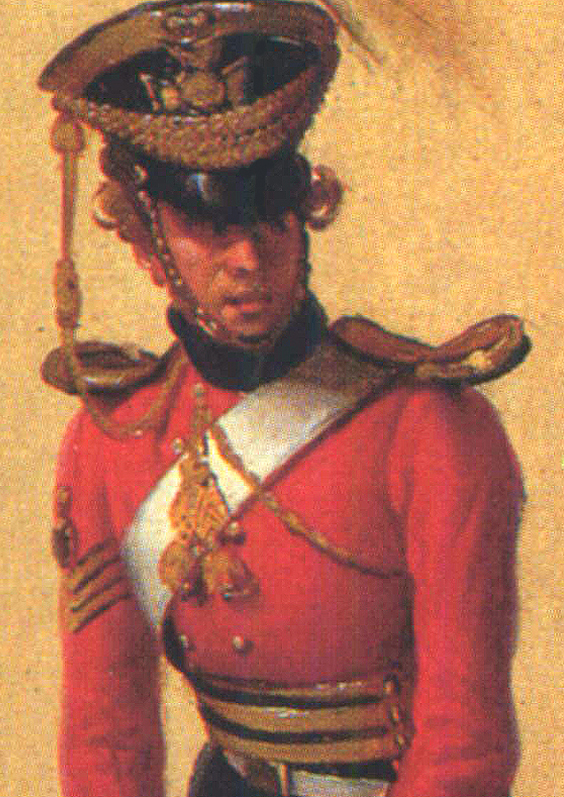 This brass badge has the battle honour PENINSULA at the base so must date after 6 April 1815 when the honour was given to the 14th Light Dragoons. A badge similar to this without the battle honour was worn by other ranks on the right side of the Tarleton helment. But by 1815 the shako had replaced the helmet and it is thought this badge was worn on the front. The regiment was titled Duchess of York’s Own in 1798 and the badge of the eagle, or hawk, was used between that date and 1830 when they became the King’s Light Dragoons.The colours of the 1829 metal badge can be seen in this photo taken at the regimental museum in Preston. The black ‘Hawk’ with gilt embellishments on a silver circle in the middle of the gilt cross that has silver hobnails in each arm of the cross. The badge is linked to the gilt boss at the top of the shako by a silver chain loop.For most of the 1820s the 14th Light Dragoons had an embroidered shako badge but in 1829 there were changes to the uniform and that included a metal badge, introducing the shape of the Maltese cross which has remained the symbol of Light Dragoons to this day. The Prussian Eagle was the centre piece of the design but replaced 2 years later by the Royal Crest when the regiment was titled the King’s Light Dragoons. The battle honours for the Peninsula War were mostly granted in February 1820 but DOURO came later on 22 July 1837.Radical changes to the uniform of the light dragoons took place in 1830 when King William IV came to the throne. He wanted his soldiers dressed in red so the blue-coated light dragoons duly changed from blue and silver to scarlet and gold. The lace around the top of this shako is now gold. The badge for the 14th LD had to change too, as the title of the regiment was now the King’s Light Dragoons. The Prussian Eagle was replaced by the Royal Crest, the name given to the badge of the lion standing on the crown. The strap around the crest has the regimental title and the six battle honours for the Peninsula War placed on the arms of the cross. The Hanoverian crown was part of the badge, placed on the top arm.After the change of title in 1830 the 14th lost the Prussian Eagle, or Hawk, from their cap badges. The sergeant painted by Dubois Drahonet in 1832 shows a very early example of NCO’s arm badge. It is an embroidered black eagle on a gilt oval. Unfortunately the artist chose to paint the badge at an awkward angle and we cannot see it properly. There is an embroidered crown over the badge. The sergeant’s cap badge is indistinct in this enlarged scan of a reproduction but the crowned Maltese cross is clear.This badge is attached to a 14th Light Dragoon shako and there is little doubt that it is genuine. But it does not conform to the generally accepted pattern of badge. The other ranks’ badge had a rim wide enough to contain the battle honours but this has only a thin rim and no battle honours. Other examples of officers’ badges follow the pattern of the other ranks.The badge worn by the rank and file of the 14th Light Dragoons was of the pattern followed by other Light Dragoon Regiments, being in the shape of the Maltese Cross. Sergeants and warrant officers had better quality badges than the lower ranks. This one is brass or gilt according to the rank of the wearer. The usual battle honours for the Peninsular War and the second Sikh War are around the rim but there is an addition that does not appear on many of the other known examples. The battle honour PERSIA is just above the central garter strap. This was granted to the regiment in 1858.The embroidered devices on the front and rear of the officers’ shabraques had these ornate designs. The Victorian cypher dates them firmly after 1837 but the lower three battle honours for PUNJAUB, CHILLIANWALLAH and GOOJERAT establish the date as 1853 to 1856. These honours were granted on 14 December 1852. However, the uniform changes of 1856 made them obsolete.NCO Arm Badge 1860