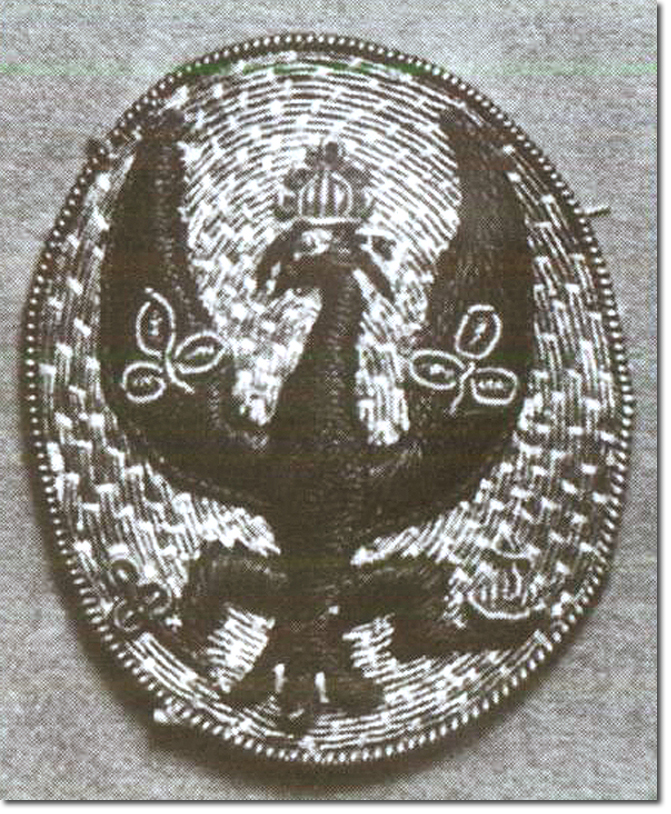 The badge here is gold with a black eagle holding gold sceptre and orb, with gold crown and trefoils on the wings in place of the usual crosses. It is 44mm high by 36 mm wide.
