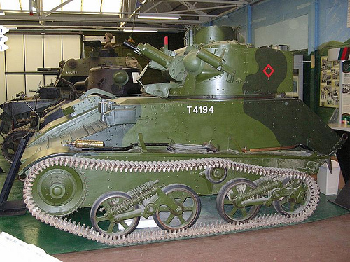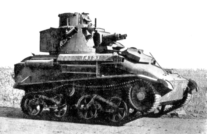 The Vickers Mk VI was the sixth in the line of light tanks built by Vickers Armstrongs for the British Army during the interwar period. The company had achieved a degree of standardisation with their previous five models, and the Mark VI was identical in all but a few respects. The turret, which had been expanded in the Mk V to allow a three-man crew to operate the tank, was further expanded to give room in its rear for a wireless set. The weight of the tank was increased to 10,800 pounds which although heavier than previous models actually improved its handling characteristics, and an 88 horsepower engine was added to the model to increase its maximum speed to 35 miles per hour. It had the Horstmann coil-spring suspension system which was found to be durable and reliable, although the fact that the tank was short in relation to its width and that it pitched violently on rough ground made accurate gunnery whilst moving exceptionally difficult. The Mk VI possessed a crew of three consisting of a driver, gunner and commander who also doubled as the radio operator, between 4 millimetres and 14 millimetres of armour, which could resist rifle and machine gun bullets, and its armament consisted of one water-cooled .303 inch and one .50 inch Vickers machine gun.
